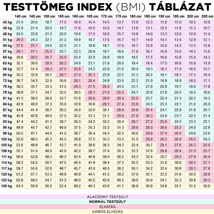 A BMI, azaz a testtömeg-index szintén gyakran használt mérőszám. Kiszámítása a testsúly kilogrammban osztva a testmagasság méterben mért négyzetével. 18,5 alatti érték soványságot, 18,5–24,9 közötti normál testsúlyt, 25–29,9 közötti túlsúlyt, 30 felett pedig elhízást jelez. Ugyanakkor az izmos testalkatú embereket ez a rendszer gyakran tévesen túlsúlyosnak minősíti.